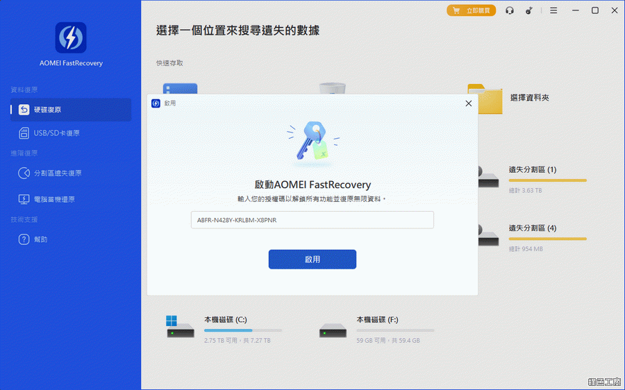 △ AOMEI FastRecovery 軟體免安裝版可以直接到文末下載,活動序號也一起打包囉!開啟軟體後從右上角點選 KEY 的符號,輸入活動所取得的序號,點選啟動。