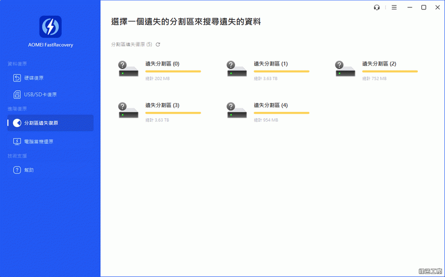 有時候電腦異常關機或是斷電等等,硬碟毀損會連分割區都消失,這時候可以使用分割區遺失復原的功能。