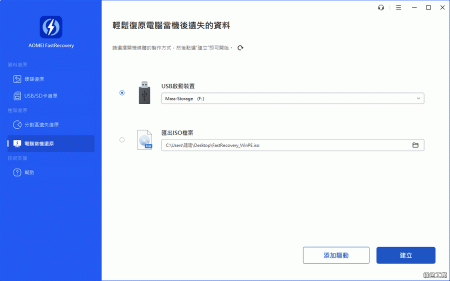除了常見的檔案救援模式之外,如果遇到整台電腦的無法開啟的時候,就算有好用的軟體也無用!所以切記 AOMEI FastRecovery 提供了非常棒的開機媒體工具,就算無法順利進入 Windows 系統,依然可以透過開機工具進入救援模式,先把重要的檔案資料舊出來再說囉!