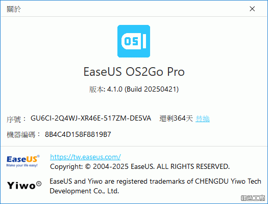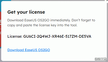 △ 馬上就可以看到這次的活動序號,EaseUS OS2Go 軟體免安裝可以直接到文末下載。