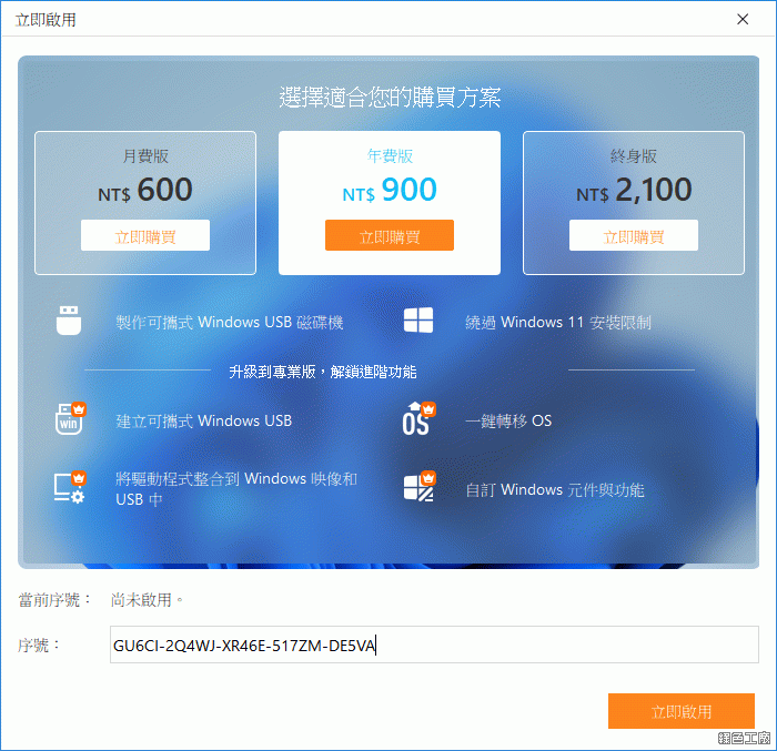 △ 開啟軟體後會跳出序號輸入視窗,將剛剛所取得的序號貼上,點選立即取用。