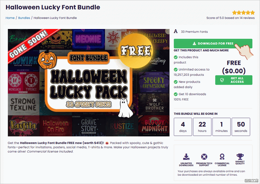 萬聖節到來!想樣製作文案與圖片,那字型準備好嗎?這次好康的 Halloween Lucky Font Bundle 限時免費活動,可以讓你把價值 413 美金的萬聖節字型打包帶走,相當於台幣 12000 元的超值好康,美編或是行銷人員不可以錯過的好康優惠,把這些好用好看好萬聖的字型一共 33 款一次帶走!