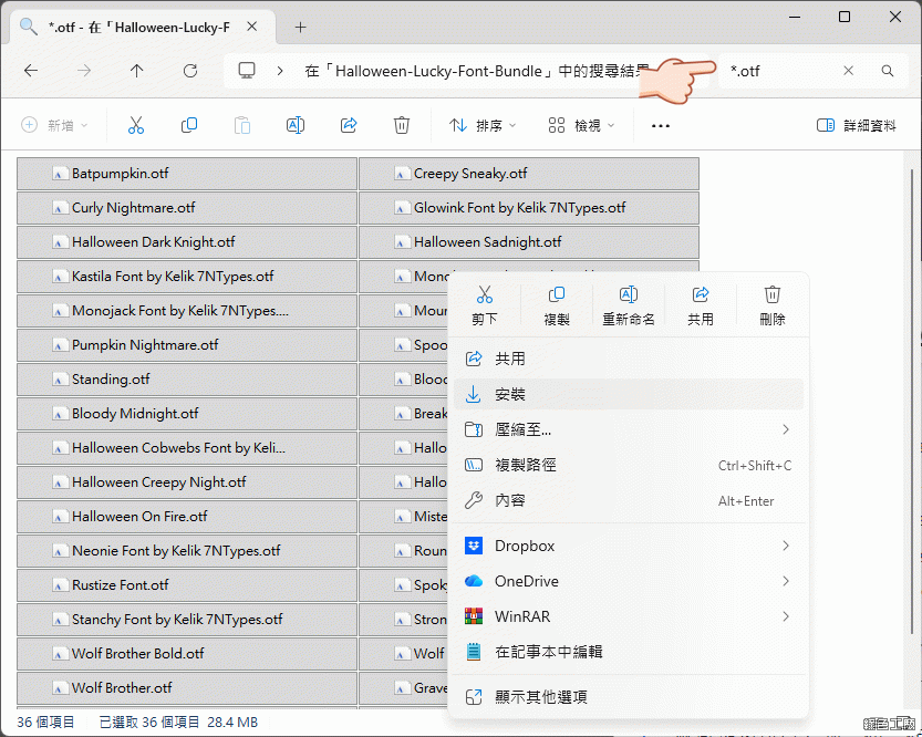 透過搜尋 *.otf 就可以列出所有的字型檔案,之後全選點選右鍵安裝即可,一共 36 款字型馬上加到自己的字型庫當中!