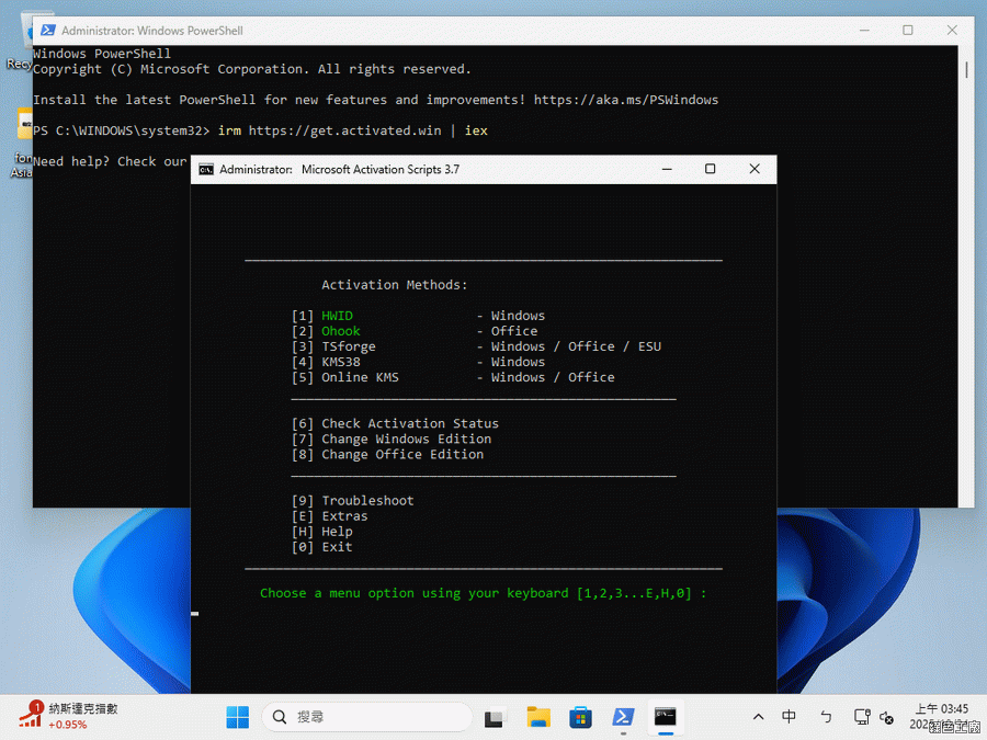 iex」,之後會跳出要啟用的選單,看是要選擇 Windows 或是 Office 都可以,不用額外自己找啟用工具,透過指令就可以完成。