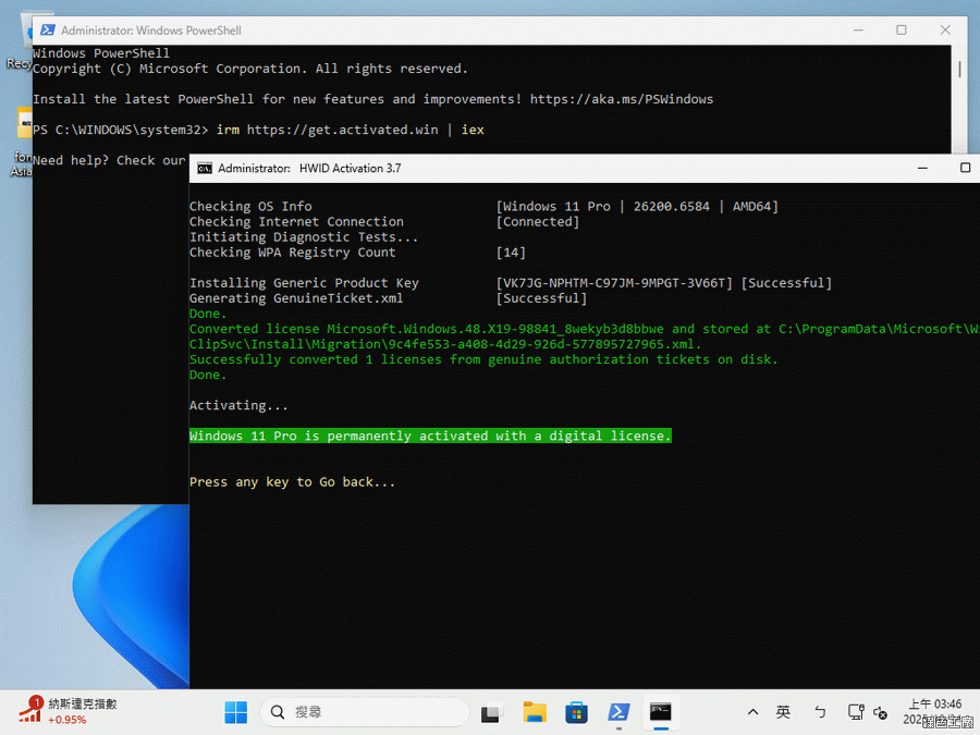 這次 tiny11 25H2 搜尋相關內容時還學會一個小妙招,就是啟動 Windows 的方法,開啟 PowerShell 後輸入「irm https://get.activated.win