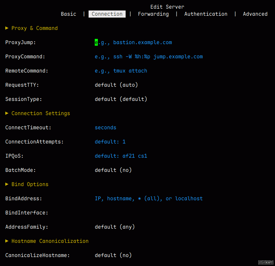此外編輯功能內還增加了比較少會用到的功能,譬如說 Connection、Forwarding、Authentication 與 Advanced,裡面就是一 些比較不常用到的設定,都可以透過 LazySSH 方便做設定,這點我覺得是很方便的地方。
