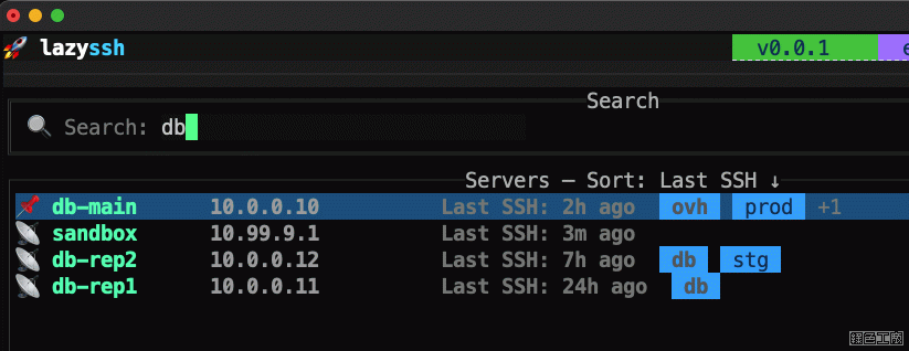 當主機比較多的時候,可以快使用 / 來做快速的搜尋,符合 vim 的使用習慣,這也是貼心的設計吧!