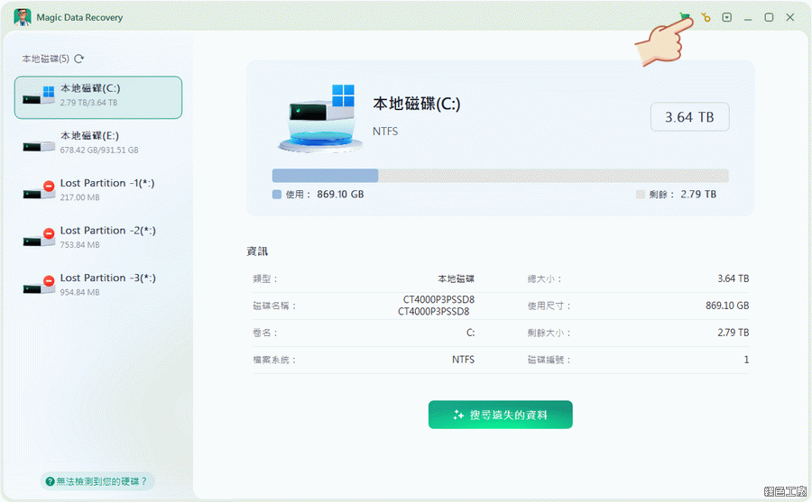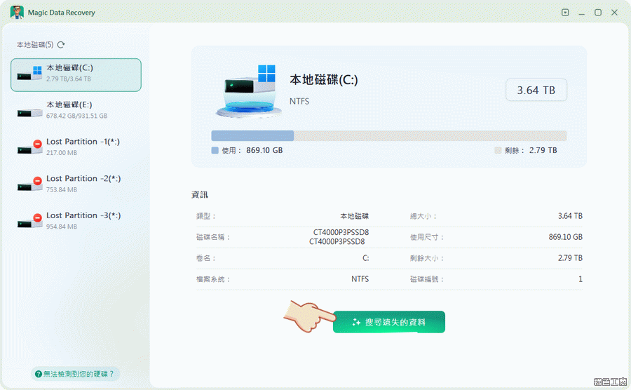 △ 救援軟體使用方式超簡單,選取要救援的硬碟,點選「搜尋遺失的資料」。