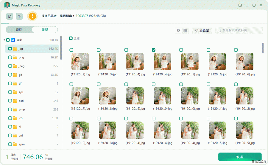 △ 支援檔案的預覽,如果要尋找遺失的圖片檔案就會很方便,勾選要復原的圖片之後,點選「恢復」來救援檔案。