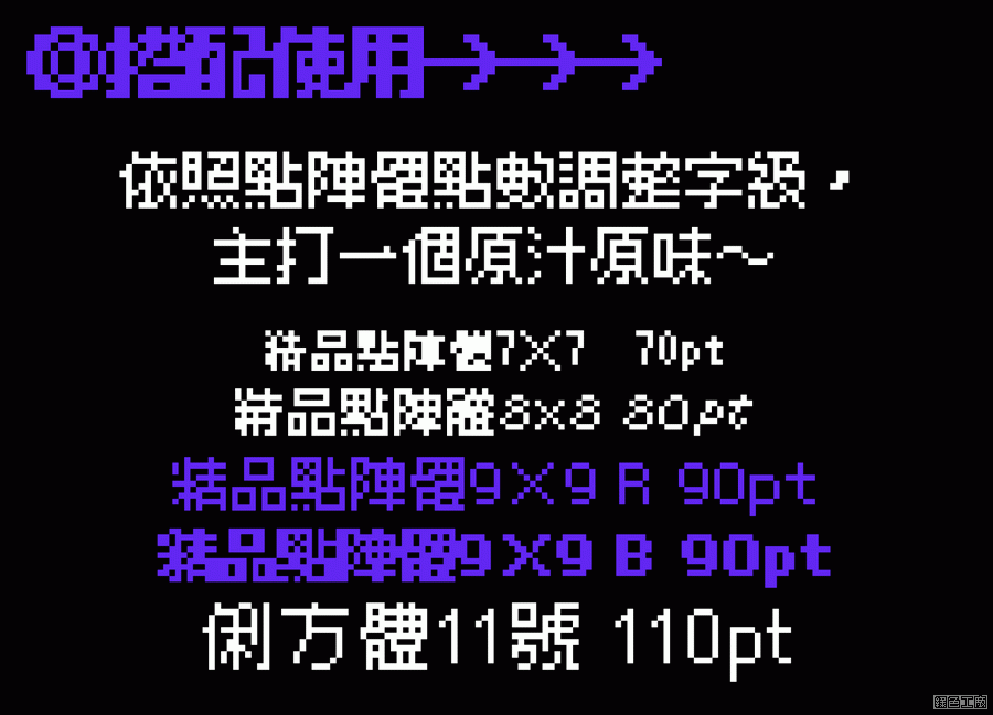 - 硬體介面設計:正在開發你的 Arduino 專案,或是設計智慧手錶、電子名牌、小型 IoT 裝置的顯示介面嗎?「精品點陣體 9×9」能夠在有限的 LCD 或 OLED 螢幕上,確保重要資訊的清晰呈現。