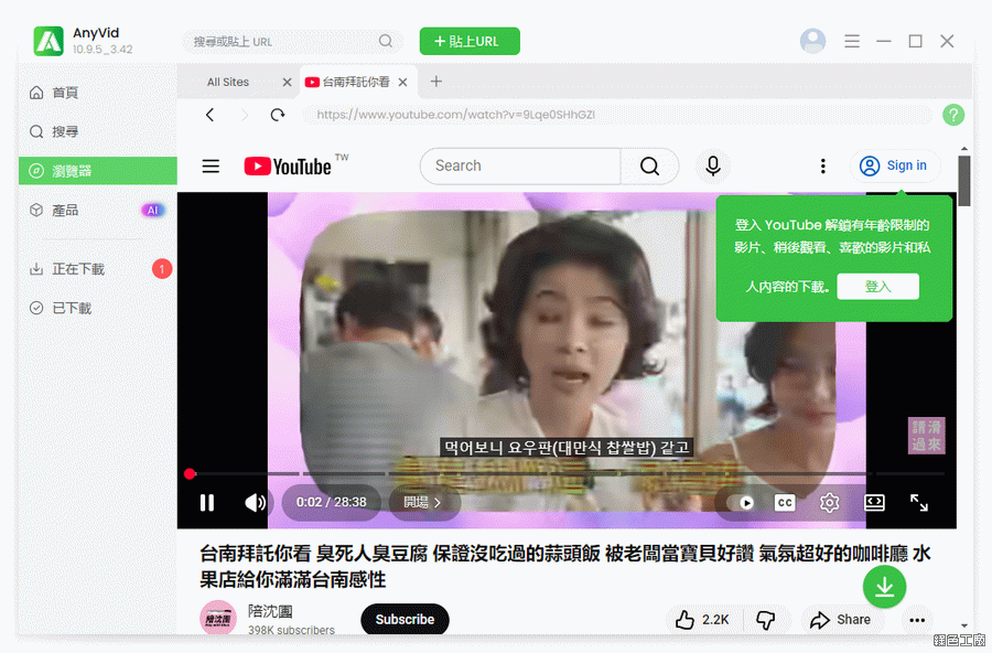 影音下載工具千萬別錯過 AnyVid,這款網路影音下載工具限時免費,而且這款支援超過 1000 個影音網站,除了能下載 YouTube、Facebook 影片之外,台灣新聞網站 UDN、蘋果日報的影片也通通都下載,當然 YouTube 上的 4K 高畫質影音也沒有問題,此外還具備有影音轉檔的功能,真是一款不可多得的方便工具,雖然說介面是英文的,不過有看到的朋友記得要大家告訴大家收下喔!