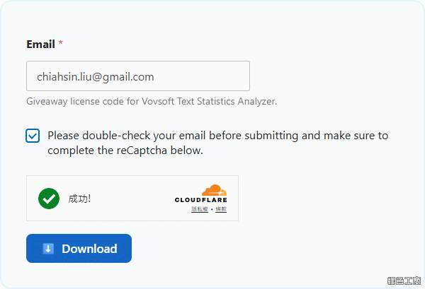△ 進入活動頁面之後輸入信箱,點選 Download 之後去信箱收信,就可以取得活動序號,免安裝版可以直接到文末下載,開啟軟體後輸入序號既可以正式啟動囉!