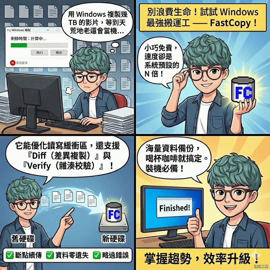 Fastcopy,最快的檔案拷貝工具!經測試,一個 424 MB 的電影其拷貝時間僅為 21 秒,傳輸速度達到了 21 MB/秒,不知比 TotalCopy之流快了多少倍,所以,在這裡我不吝惜自己的讚美,把「最快的檔案拷貝工具」這個桂冠送給它,如果你發現還有比它更快的,煩請來信告知,我將非常感謝!